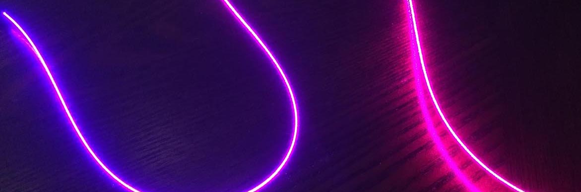 We are excited and proud to announce the world's first Laser Wire System called OpalDrive. A complete package for retail, trade shows, events, productions, wearables, safety and more. Laser Wire is a super thin (900um ~ 0.9mm) lighted wire that lights up 360° beautifully. If you are familiar with EL Wire, Laser Wire addresses each drawback of EL Wire and makes it better. It's thinner, brighter, more flexible, doesn't hold a memory, lighter, consumes less power, more vibrant colors, ability to integrate into wearables, fabrics, wood, metal, and more. The future of lighting is here, today. Check out some images below of the vibrancy of Laser Wire and how it can be used.